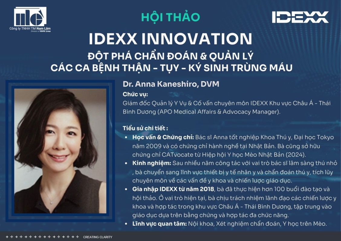 - Dr. Anna Kaneshiro: Giám đốc y vụ và cố vấn chuyên môn IDEXX – Khu vực Châu Á – Thái Bình Dương.